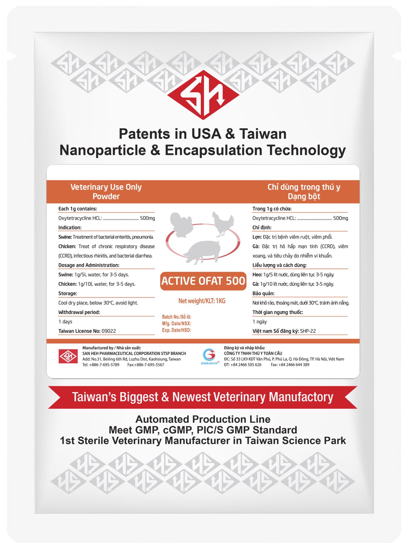 ACTIVE OFAT 500 là sản phẩm kháng sinh thế hệ mới chứa hoạt chất oxytetracycline hydrochloride hàm lượng cao (50%), chuyên biệt trong điều trị các bệnh đường hô hấp mãn tính ở heo và gia cầm, đặc biệt hiệu quả với Mycoplasma suis trên heo và viêm buồng trứng, ống dẫn trứng ở gà đẻ – những bệnh lý làm giảm nghiêm trọng năng suất chăn nuôi và gây thiệt hại lớn cho trang trại.
